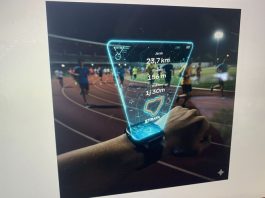 Edit gambar tersebut menjadi hologram biru futuristik yang muncul dari smartwatch. Hologram muncul dengan bingkai yang bercahaya dan memiliki antarmuka yang canggih. Hologram menampilkan data persis yang muncul pada gambar tersebut. Latar di trek lari pada malam hari yang banyak orang-orang berlari. Smartwatch digunakan di pergelangan tangan kiri.Hologram Transparan di Atas Smartwatch