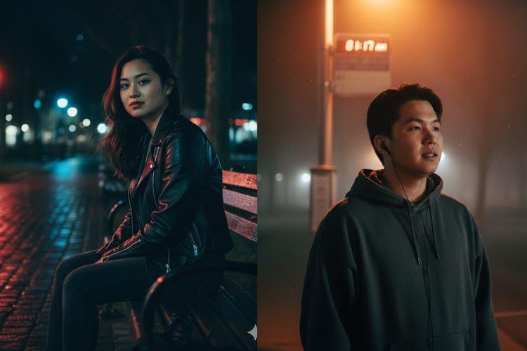 - Potret cewek duduk di bangku taman malam hari, dikelilingi lampu neon. Ekspresinya tenang, dengan efek refleksi cahaya berwarna biru dan merah seperti adegan film arthouse.