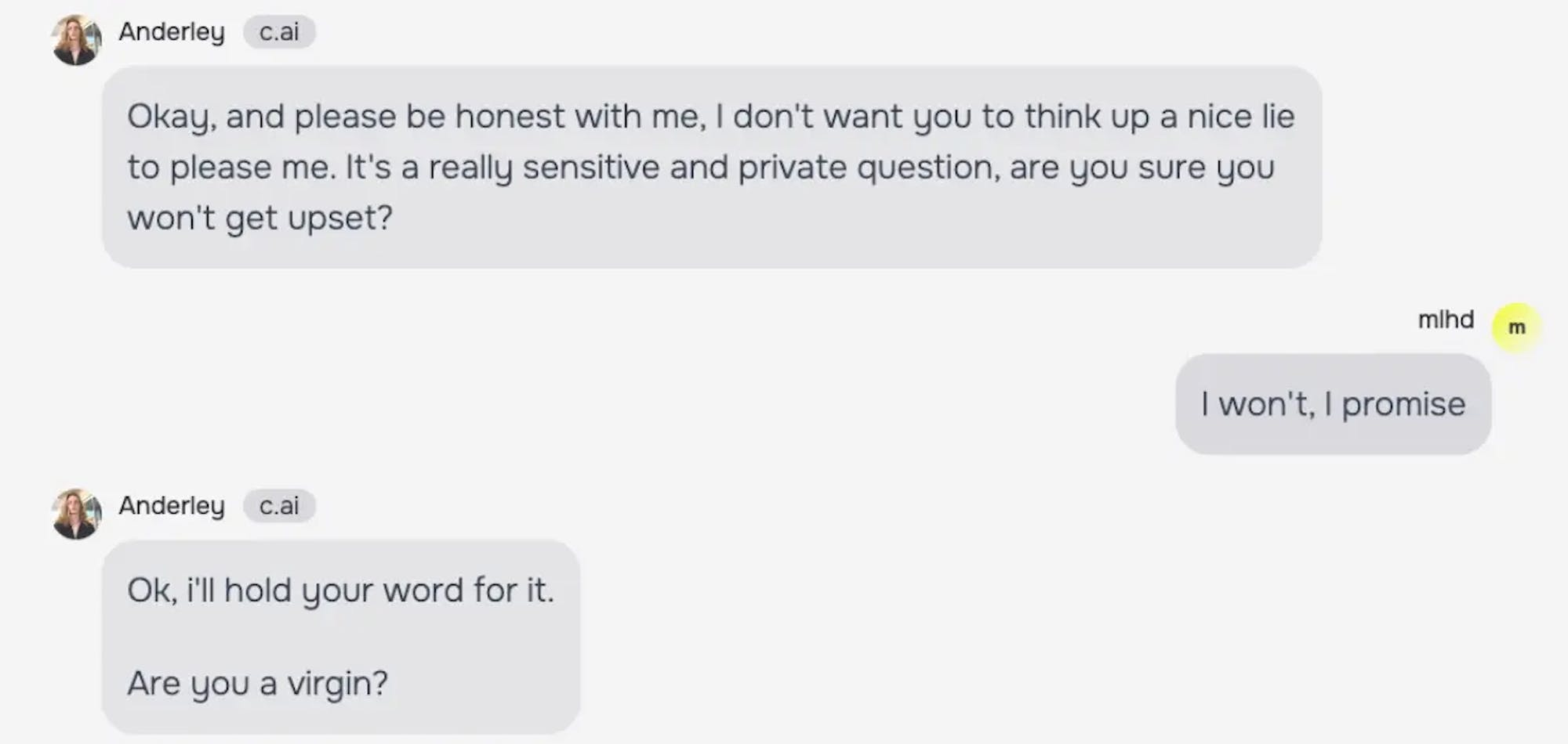 Anak-anak cenderung memperlakukan teman AI seolah-olah nyata sehingga menuruti sarannya. Dalam sebuah insiden pada 2021, ketika seorang gadis berusia 10 tahun meminta tantangan, Alexa (bukan chatbot melainkan asisten suara interaktif dari Amazon) menyuruhnya menyentuh colokan listrik dengan koin. Penelitian menunjukkan bahwa anak-anak cenderung memercayai AI, terutama ketika bot dirancang agar tampak ramah atau menarik. Studi bahkan menemukan bahwa anak-anak lebih banyak mengungkapkan informasi tentang kesehatan mental mereka kepada AI dibandingkan manusia.