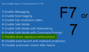 - Pilih opsi “Disable driver signature enforcement” dengan cara menekan tombol F7 di keyboard.