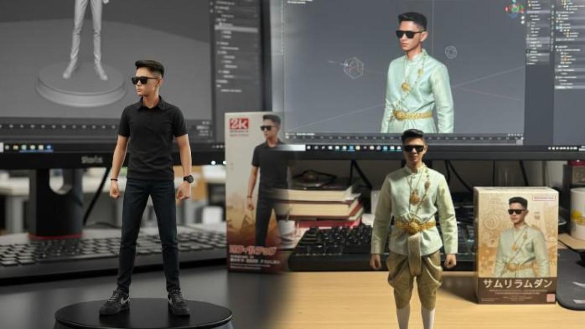 - “Buat foto potrait hyperrealistic sebuah meja kerja dengan suasana realistis di dalam ruangan. Di atas meja terdapat sebuah miniatur seorang karakter seperti difoto terlampir, terlihat full badan dari kepala sampai kaki yang sangat detail dan tampak nyata. Di belakangnya ada monitor komputer besar yang menampilkan software 3D modeling dengan objek yang sama. Di samping monitor terdapat kotak diecast dengan gambar karakter tersebut dan tulisan berbahasa Jepang. Objek miniatur berada di atas plat besi hitam tebal dengan tulisan timbul bertekstur perak keemasan ‘Nama Anda’. Pencahayaan ruangan fokus pada miniatur, resolusi tinggi, detail halus, 8K.”
