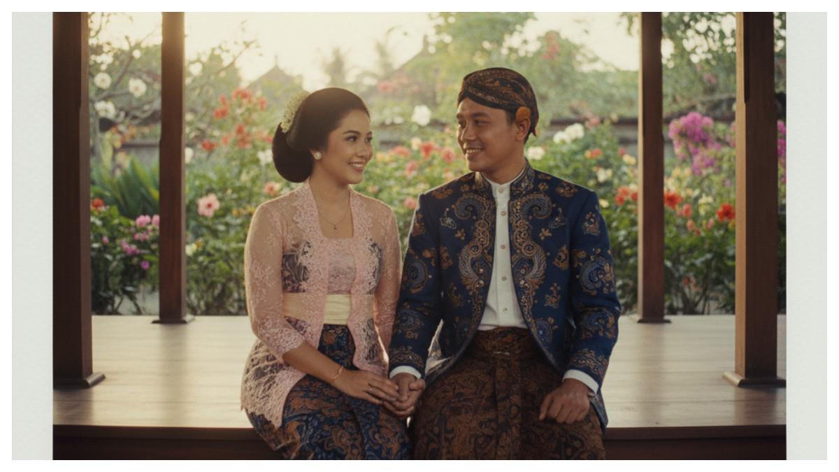 “Buat kedua orang dalam foto terlampir menjadi fotorealistik seorang perempuan mengenakan kebaya kutubaru hijau sage dengan bordir renda dan jarik batik motif parang. Ia duduk anggun di pendopo kayu jati, dikelilingi pilar ukiran dan cahaya pagi yang lembut menembus sela-sela. Rambutnya disanggul klasik dengan hiasan bunga melati. Buat Pria duduk disampingnya memakai baju beskap Jawa berwarna hitam, memakai blangkon warna senada, dan jarik batik motif parang yang dililitkan rapi dipinggangnya.”
