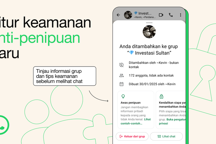 WhatsApp juga memperkenalkan kontrol privasi yang memungkinkan pengguna menentukan siapa saja yang bisa menambahkan mereka ke dalam grup. Hal ini sangat penting karena banyak penipu sering kali memasukkan korban ke dalam grup yang mencurigakan. Untuk mengatasi hal ini, WhatsApp kini menampilkan notifikasi keamanan saat seseorang dimasukkan ke dalam grup oleh orang tak dikenal. Pengguna akan diberi tahu tentang grup tersebut, termasuk siapa yang menambahkan mereka, dan dapat langsung keluar tanpa membuka percakapan. Notifikasi ini akan dibisukan otomatis hingga pengguna memutuskan untuk tetap tinggal atau meninggalkan grup tersebut.