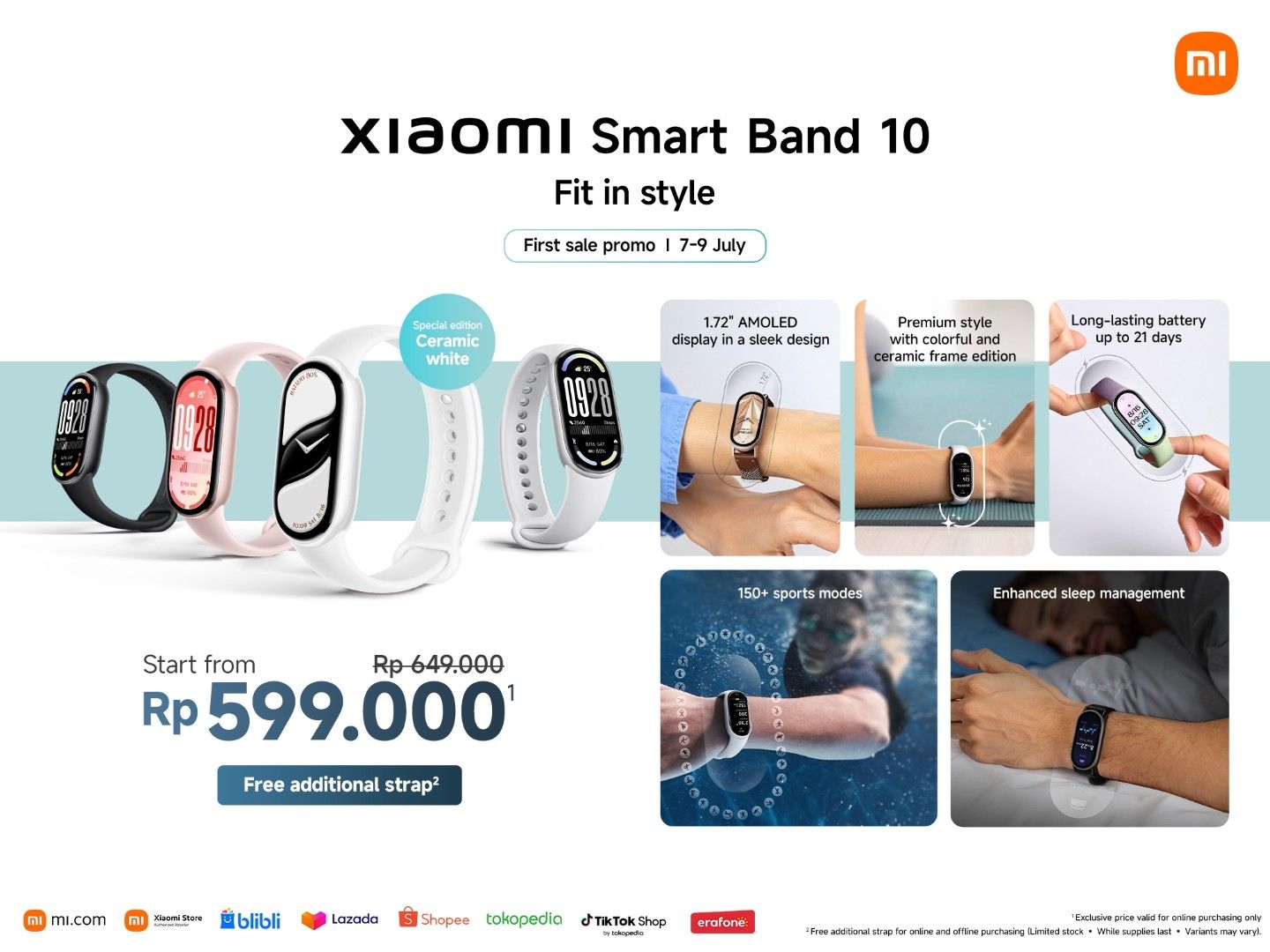 Xiaomi Smart Band 10 tersedia mulai 7 Juli 2025 melalui Mi.com, Xiaomi Official Store di berbagai e-commerce, dan toko offline seperti Xiaomi Store dan Erafone.